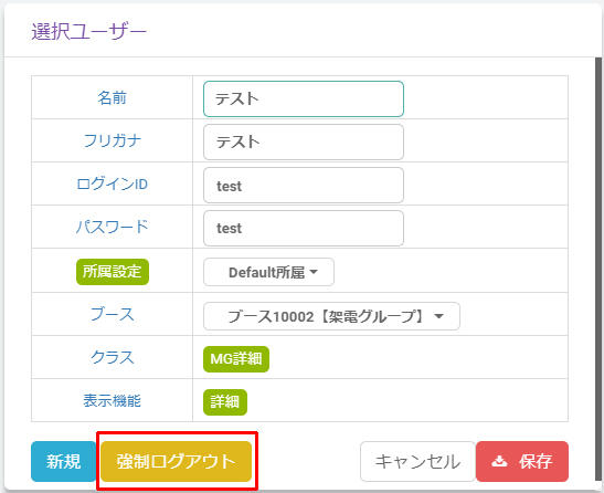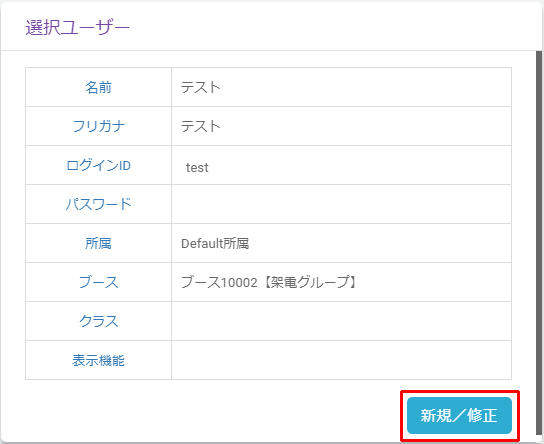 2.強制ログアウトさせたいユーザーを選択し、選択ユーザー画面の「新規/修正」ボタンをクリックしてください。